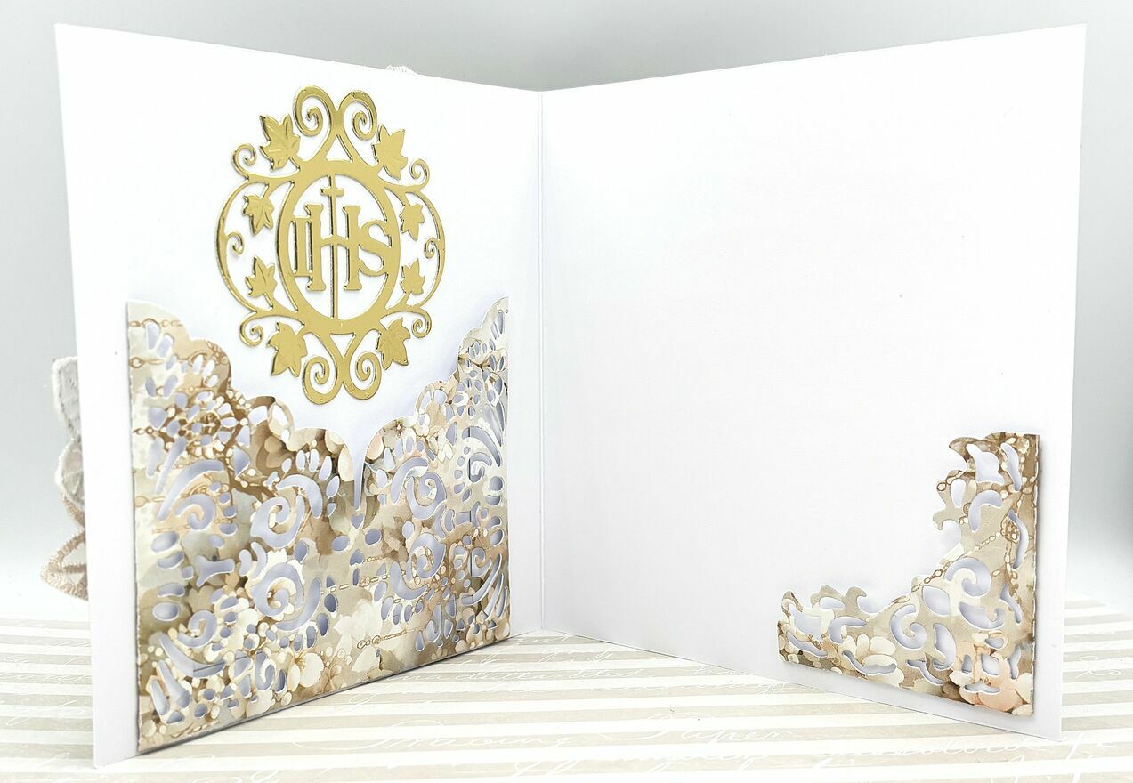 Wnętrze: Wykończone ozdobną kieszonką na banknot (z motywem IHS) oraz miejscem na wpisanie osobistych życzeń.