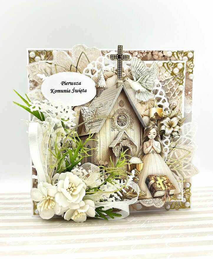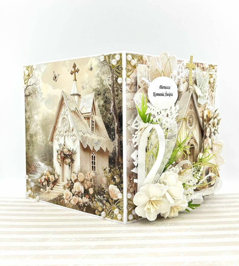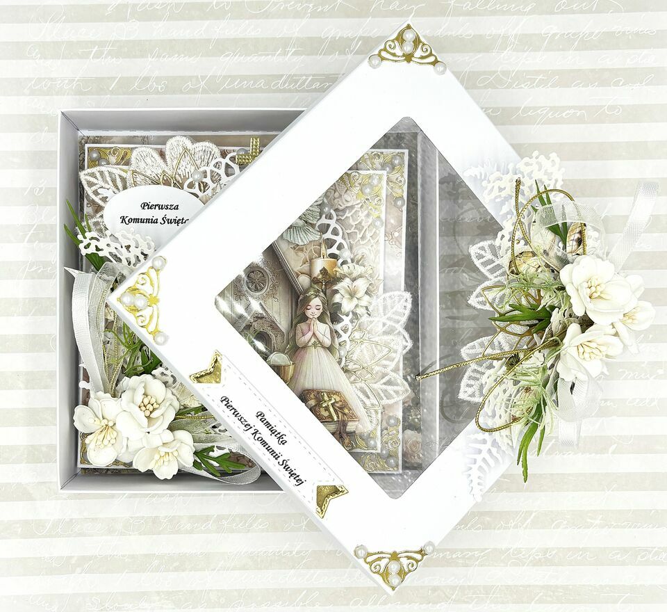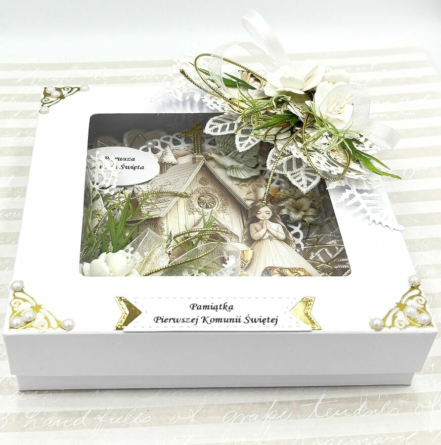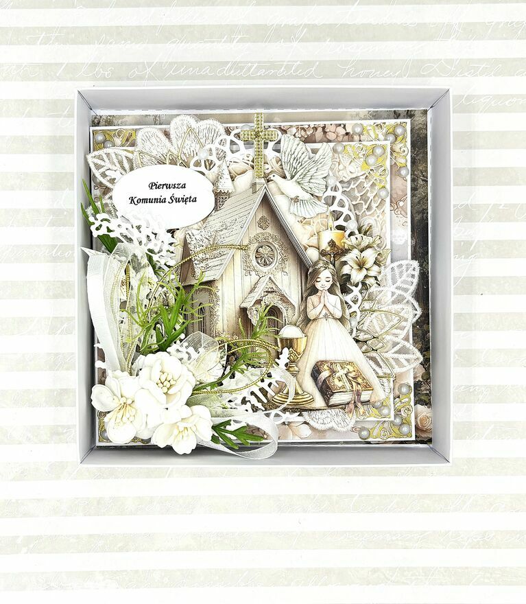 Pamiątka Pierwszej Komunii Świętej – Ręcznie Robiona Kartka 3D w Ozdobnym PudełkuPrzedstawiam Państwu wyjątkowy zestaw komunijny, który zachwyca precyzją wykonania i głębią kompozycji. To pamiątka stworzona w technice scrapbookingu, gdzie każda warstwa została starannie dobrana, by stworzyć trójwymiarowy obraz pełen symboliki i elegancji.